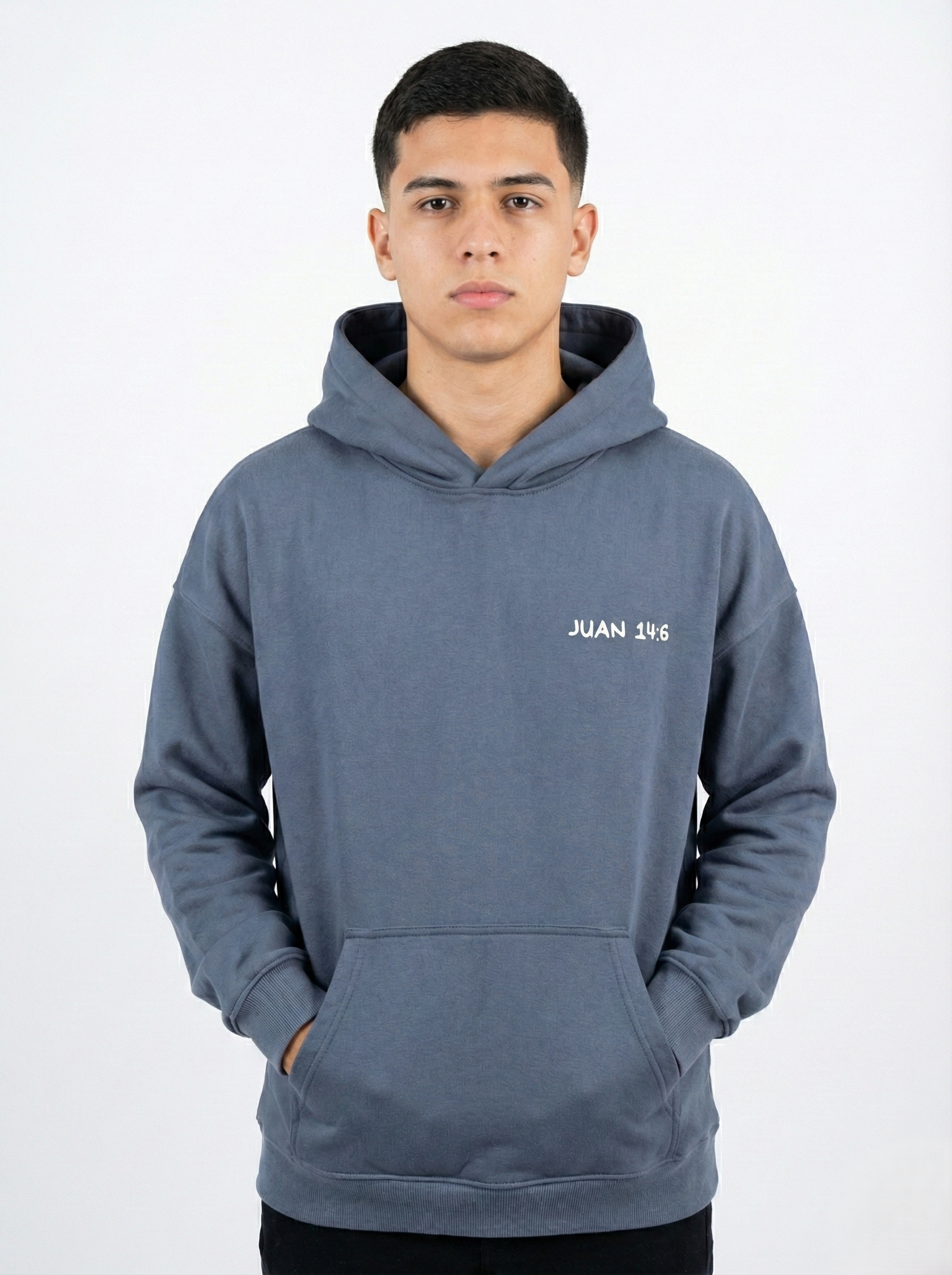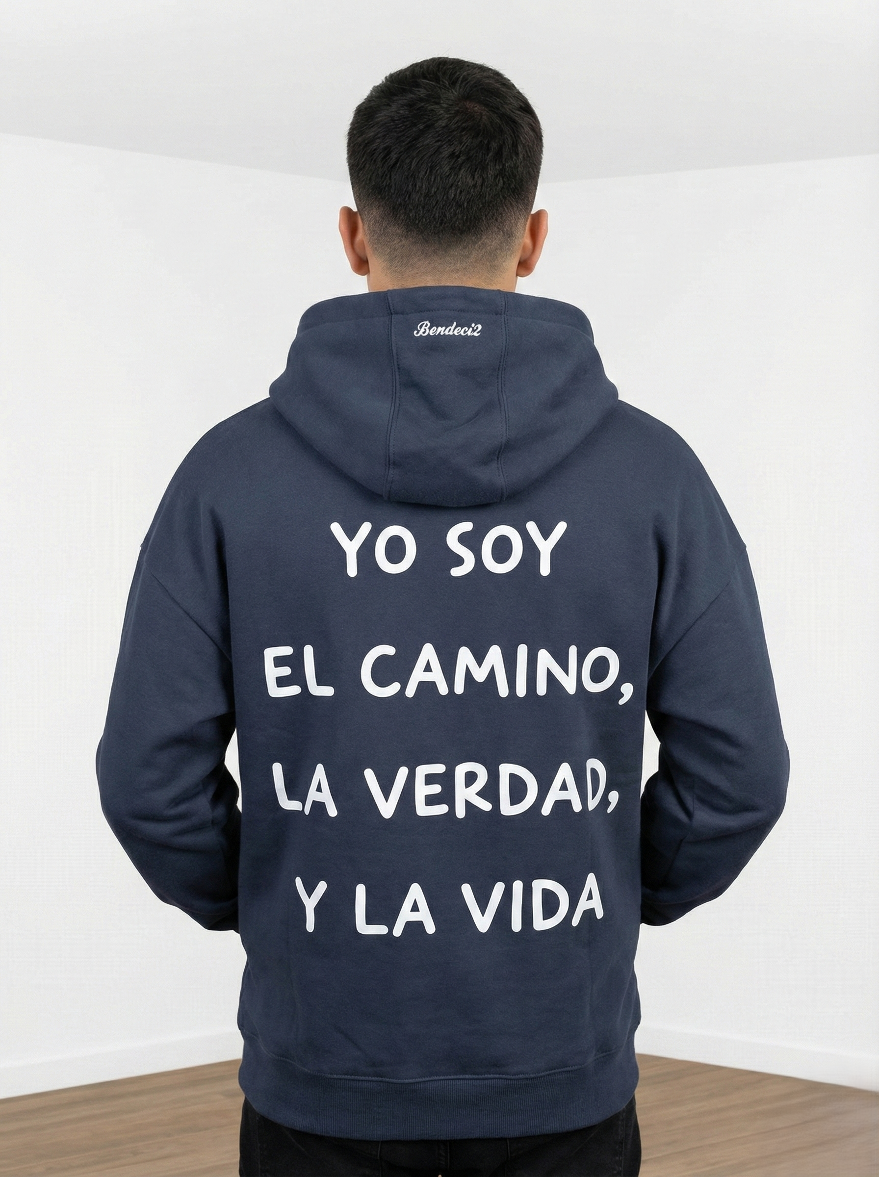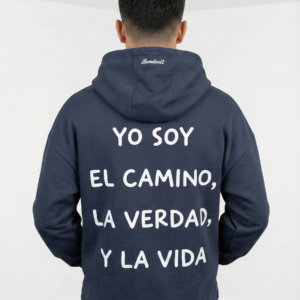 Declara tu fe con fuerza y estilo. Este cómodo buzo lleva en la espalda una de las afirmaciones más potentes de Jesús: «YO SOY EL CAMINO, LA VERDAD, Y LA VIDA» en tipografía blanca y clara. El diseño se completa con el sello de identidad de la marca «Bendeci2» ubicado sutilmente en el borde de la capucha. Una prenda esencial para abrigarte con propósito y llevar un mensaje de esperanza donde vayas.
