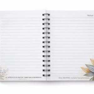 Su interior cuenta con hojas rayadas, frases bíblicas inspiradoras y espacio para tomar notas, reflexionar y registrar lo que Dios va haciendo en tu vida.
