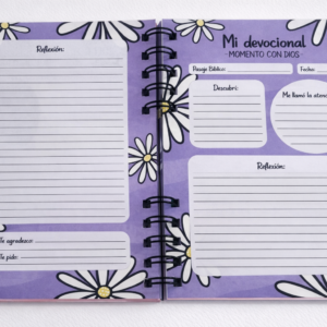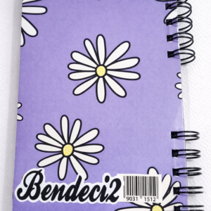 Su tapa flexible en color violeta con delicadas flores transmite calma y alegría, mientras que su encuadernado anillado permite una apertura cómoda y un uso duradero.