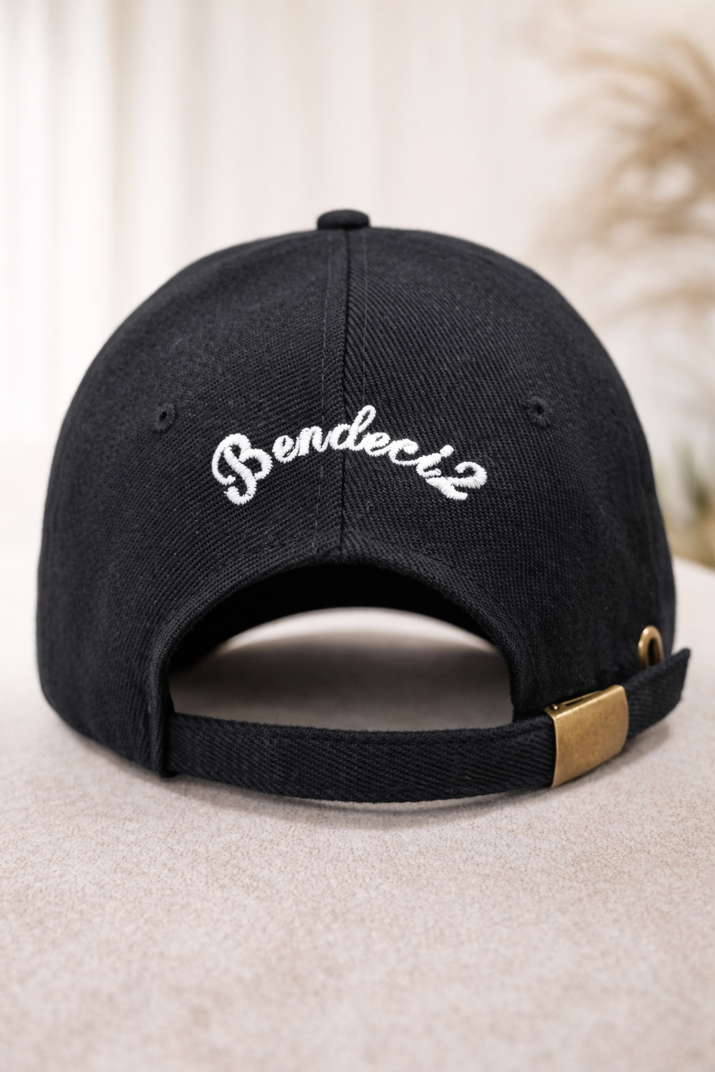 Fabricada con materiales de alta calidad, su estructura curva brinda un calce cómodo y moderno, ideal tanto para uso diario como para momentos especiales. El bordado frontal transmite el mensaje con carácter, mientras que el logo Bendeci2 en la parte trasera refuerza una estética premium y minimalista.