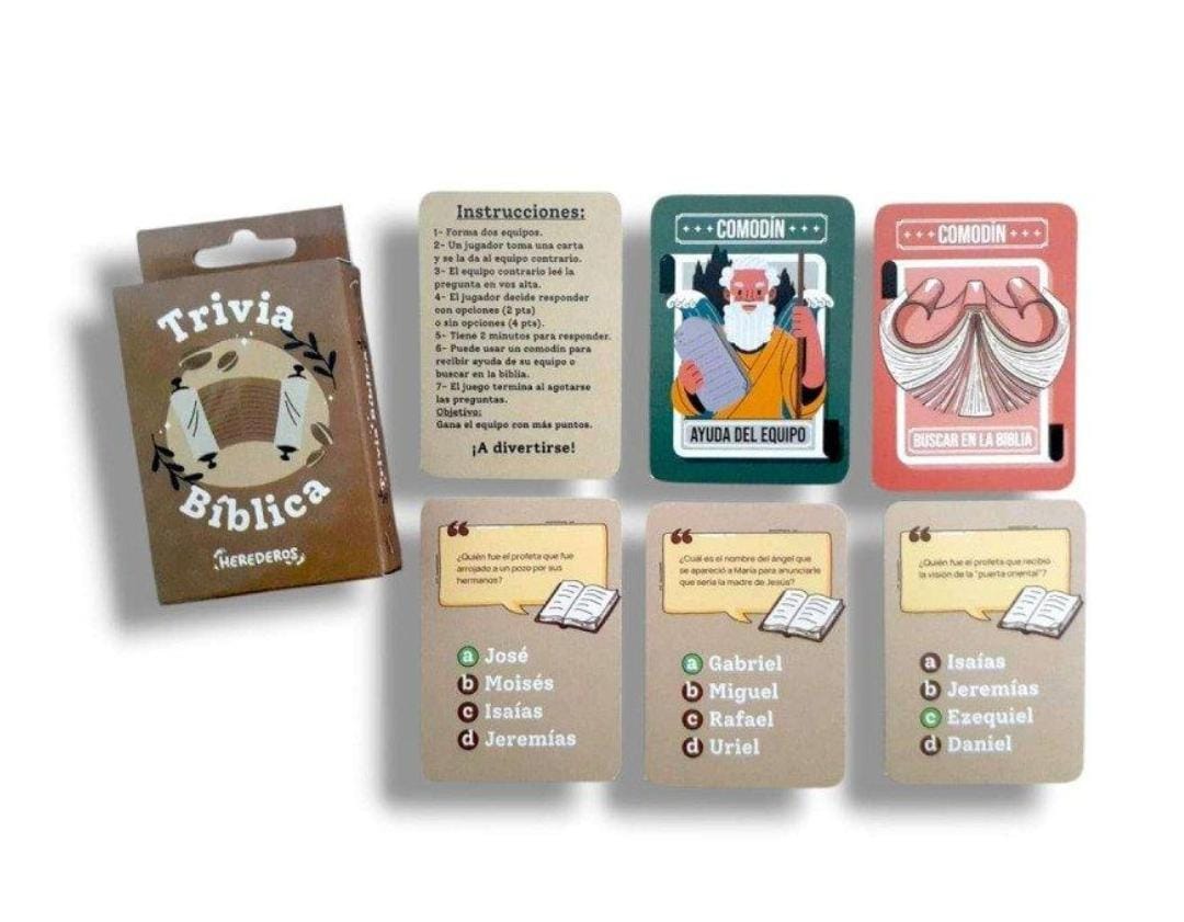 Trivia Bíblica es un juego de cartas cristiano diseñado para compartir momentos de alegría, aprendizaje y unión entre amigos, familia y grupos de iglesia. Cada carta contiene preguntas sobre personajes, historias y pasajes bíblicos que desafiarán tu memoria y fortalecerán tu conocimiento de la Biblia.