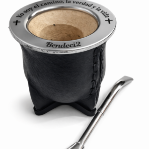 Fabricado con calabaza natural, forrado en cuero cosido a mano y terminado con una virola de acero inoxidable grabada, este mate combina tradición, calidad y un mensaje que inspira.