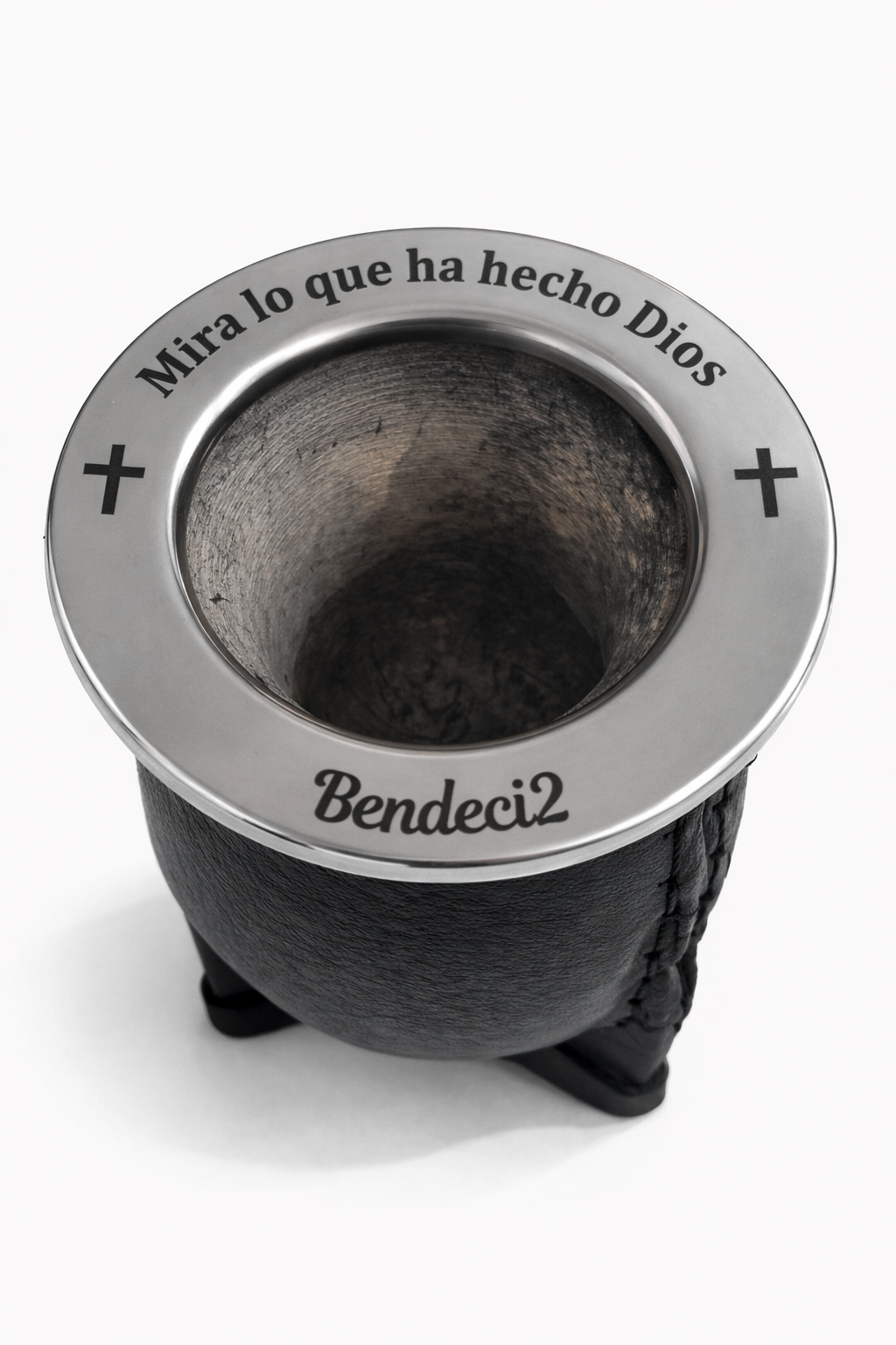 Fabricado en calabaza natural, forrado a mano en cuero negro premium y terminado con un aro de acero inoxidable grabado, este mate combina tradición, diseño y un profundo mensaje espiritual.