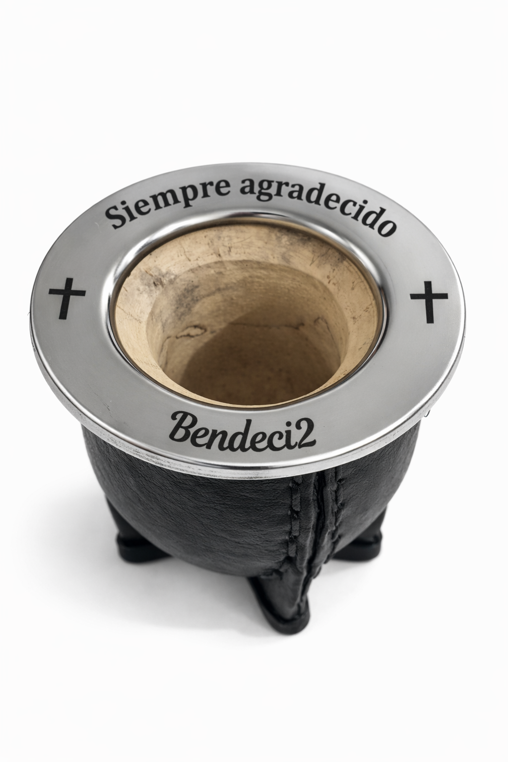 El mate está elaborado en calabaza natural, lo que garantiza una experiencia de sabor auténtica, y está forrado en cuero negro cosido a mano, aportando resistencia, estética premium y un agarre cómodo. En la boca cuenta con un aro de acero inoxidable grabado con la frase “Siempre agradecido”, acompañada de cruces y el sello Bendeci2, creando una pieza única, sobria y significativa.
